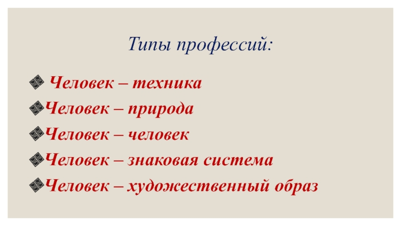 Типы профессий: Человек – техникаЧеловек – природаЧеловек – человекЧеловек – знаковая системаЧеловек – художественный образ