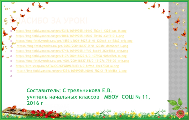 Спасибо за урок!http://img-fotki.yandex.ru/get/9315/16969765.164/0_7b3e1_43261cac_M.png http://img-fotki.yandex.ru/get/9065/16969765.165/0_7b416_a31f610_L.pnghttps://img-fotki.yandex.ru/get/15521/200418627.81/0_120bc6_ce158a2_orig.png https://img-fotki.yandex.ru/get/9650/200418627.7f/0_1203fc_dab6accf_L.pnghttp://img-fotki.yandex.ru/get/9745/16969765.1ff/0_8ccd4_2f2e856a_orig.pnghttp://img-fotki.yandex.ru/get/5107/200418627.9/0_107908_908cd7e6_M.png https://img-fotki.yandex.ru/get/4001/200418627.85/0_12127c_793100_orig.pnghttp://kira-scrap.ru/KATALOG/OFORMLENIE/1/0_8c9ad_1bc17300_M.png http://img-fotki.yandex.ru/get/9354/16969765.160/0_7b242_f81de58a_L.png Составитель: С трельникова Е.В.
