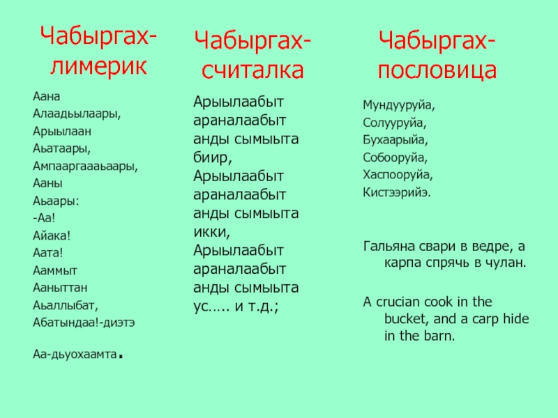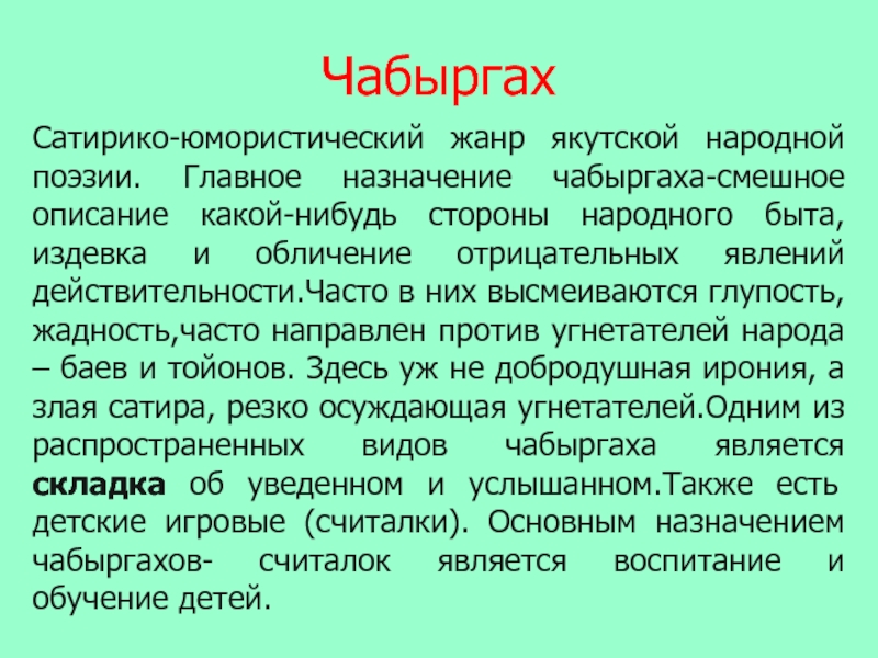 народного быта, издевка и обличение отрицательных явлений действительности.Часто в них высмеиваются глупость, жадность,часто направлен против угнетателей народа – баев и тойонов. Здесь уж не добродушная ирония, а злая сатира, резко осуждающая угнетателей.Одним из распространенных видов чабыргаха является складка об уведенном и услышанном.Также есть детские игровые (считалки). Основным назначением чабыргахов- считалок является воспитание и обучение детей.