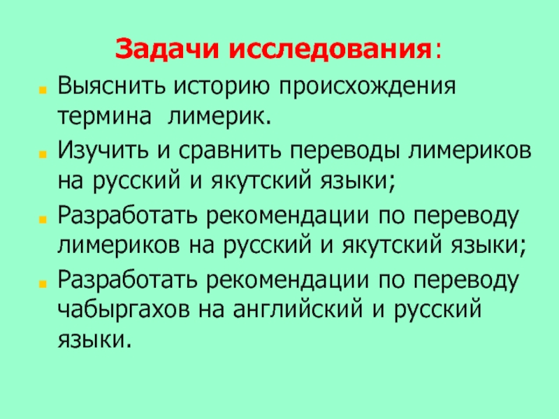 Разработать рекомендации по переводу лимериков на русский и якутский языки;