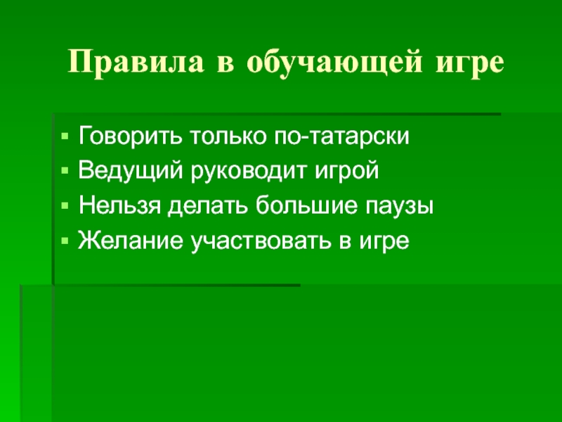 Правила в обучающей игреГоворить только по-татарскиВедущий руководит игройНельзя делать большие паузыЖелание участвовать в игре