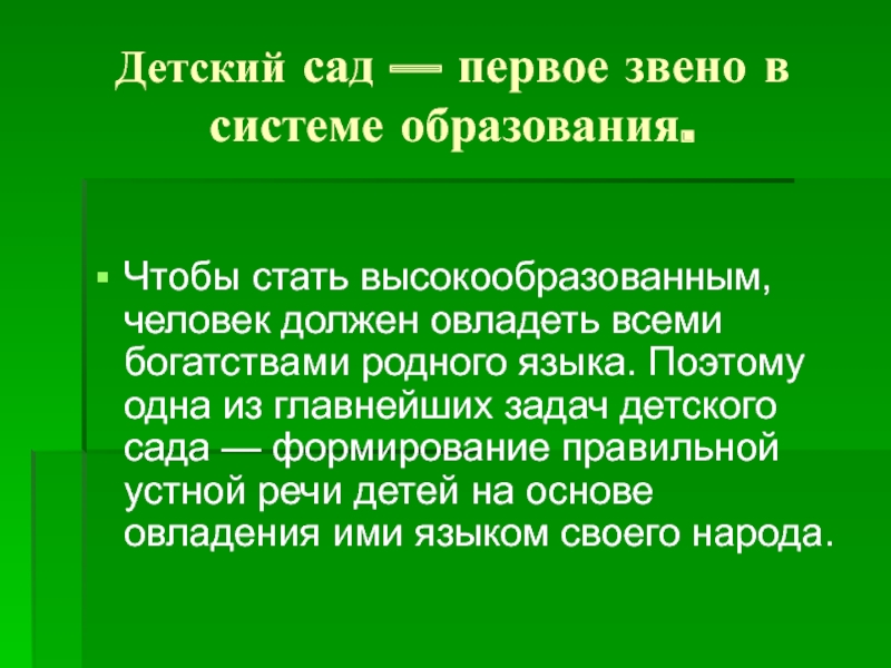 Детский сад — первое звено в системе образования.Чтобы стать высокообразованным, человек должен овладеть всеми богатствами родного языка.