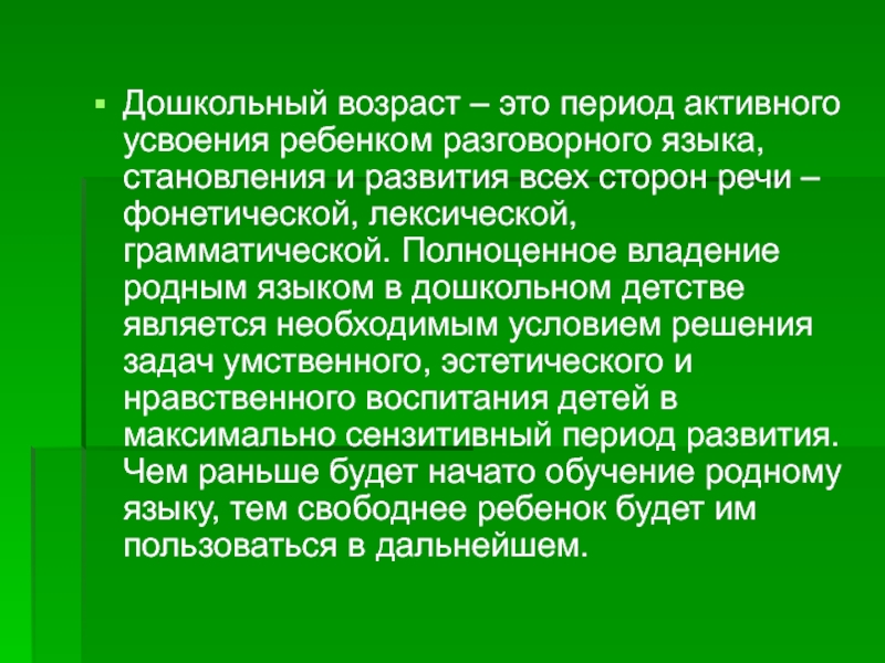 и развития всех сторон речи – фонетической, лексической, грамматической. Полноценное владение родным языком в дошкольном детстве является необходимым условием решения задач умственного, эстетического и нравственного воспитания детей в максимально сензитивный период развития. Чем раньше будет начато обучение родному языку, тем свободнее ребенок будет им пользоваться в дальнейшем.