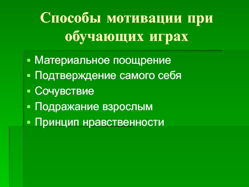 Способы мотивации при обучающих играхМатериальное поощрениеПодтверждение самого себяСочувствиеПодражание взрослымПринцип нравственности