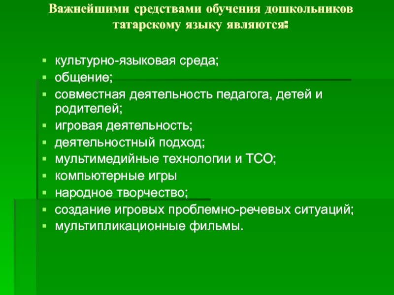 Важнейшими средствами обучения дошкольников татарскому языку являются: культурно-языковая среда;общение;совместная деятельность педагога, детей и родителей;игровая деятельность;деятельностный подход;мультимедийные технологии