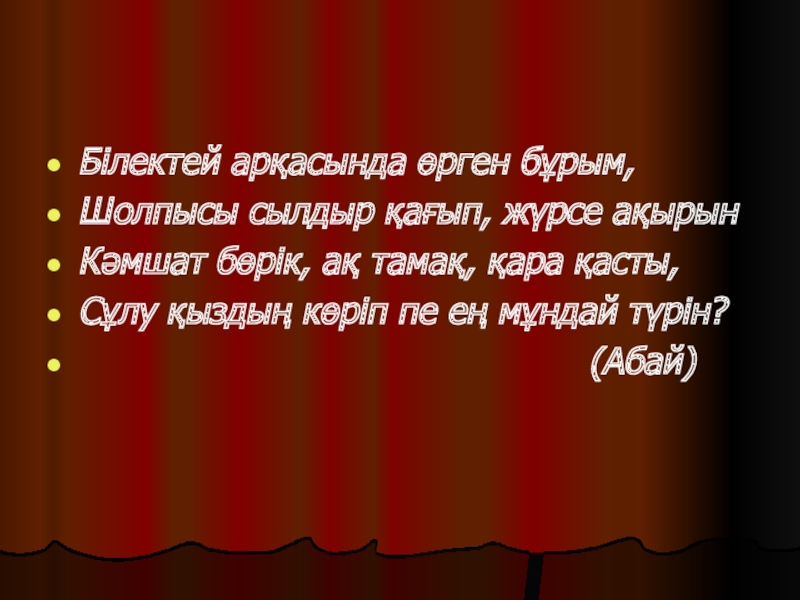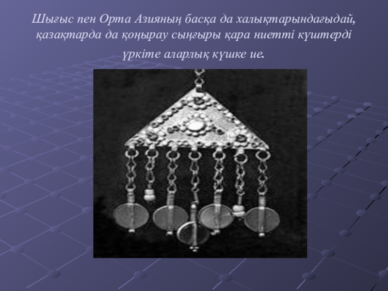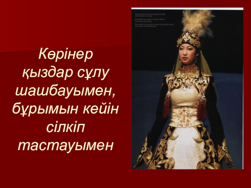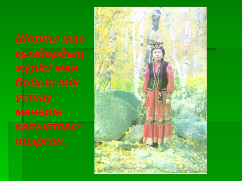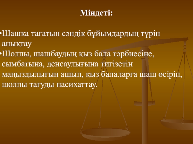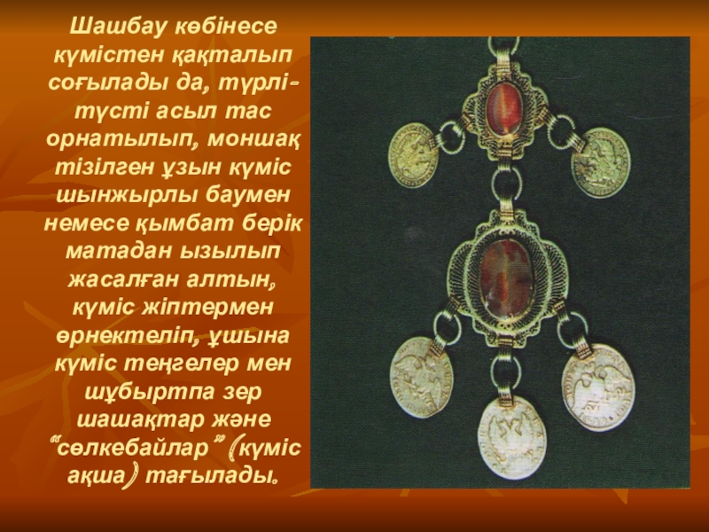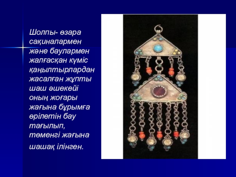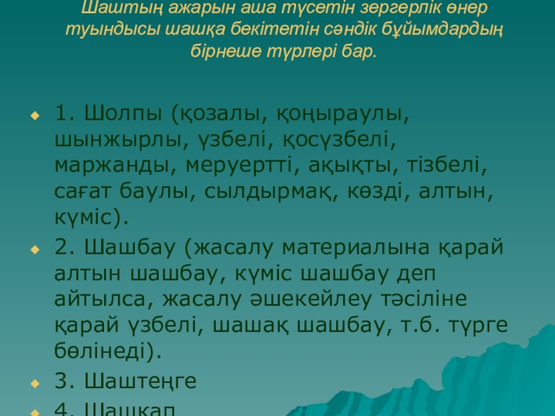 1. Шолпы (қозалы, қоңыраулы, шынжырлы, үзбелі, қосүзбелі, маржанды, меруертті, ақықты, тізбелі, сағат баулы, сылдырмақ, көзді, алтын, күміс).