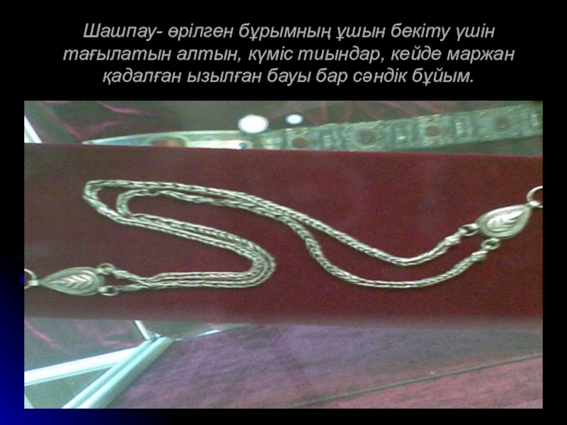 2. Шашбау (жасалу материалына қарай алтын шашбау, күміс шашбау деп айтылса, жасалу әшекейлеу тәсіліне қарай үзбелі, шашақ шашбау, т.б. түрге бөлінеді).