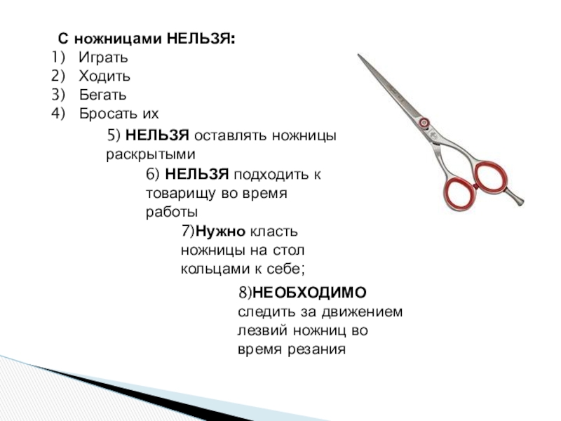 7)Нужно класть ножницы на стол кольцами к себе;