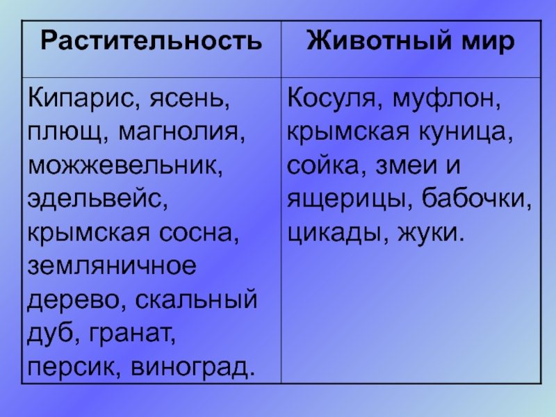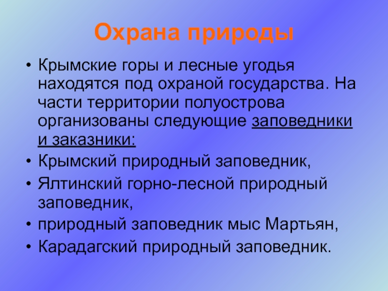 Охрана природыКрымские горы и лесные угодья находятся под охраной государства. На части территории полуострова организованы следующие заповедники