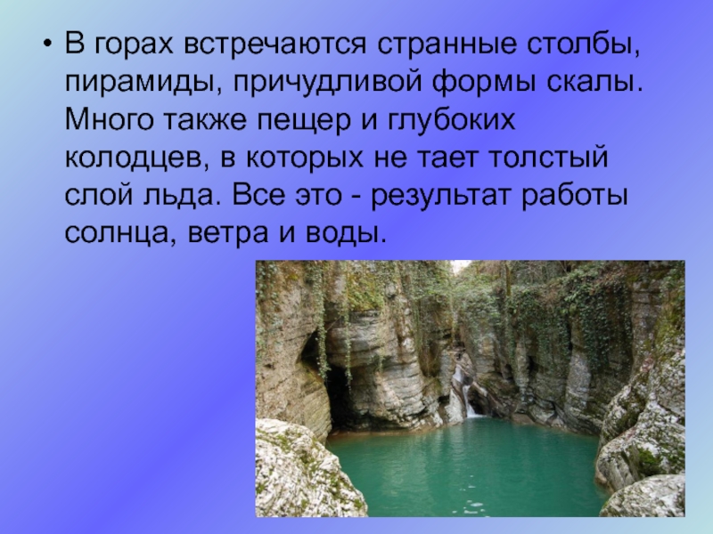 Слайд 3В горах встречаются странные столбы, пирамиды, причудливой формы скалы. Много также