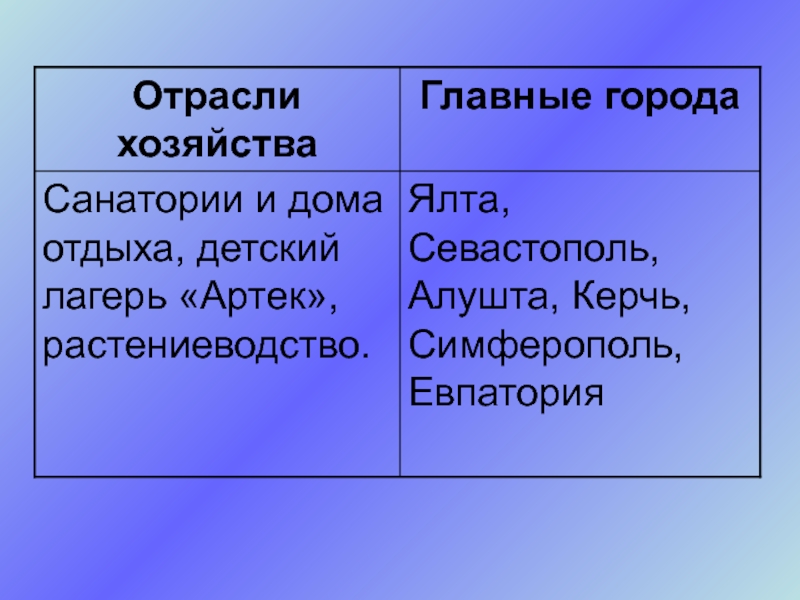 Крупнейшие города: Ялта, Севастополь, Алушта, Симферополь, Керчь, Евпатория.