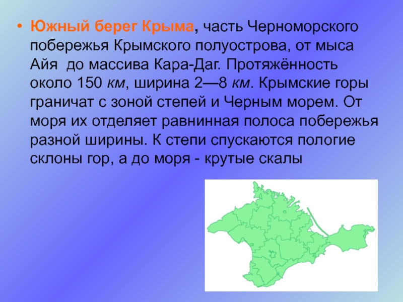 Слайд 2Южный берег Крыма, часть Черноморского побережья Крымского полуострова, от мыса Айя