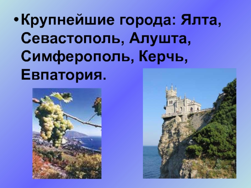 Слайд 21Крупнейшие города: Ялта, Севастополь, Алушта, Симферополь, Керчь, Евпатория.