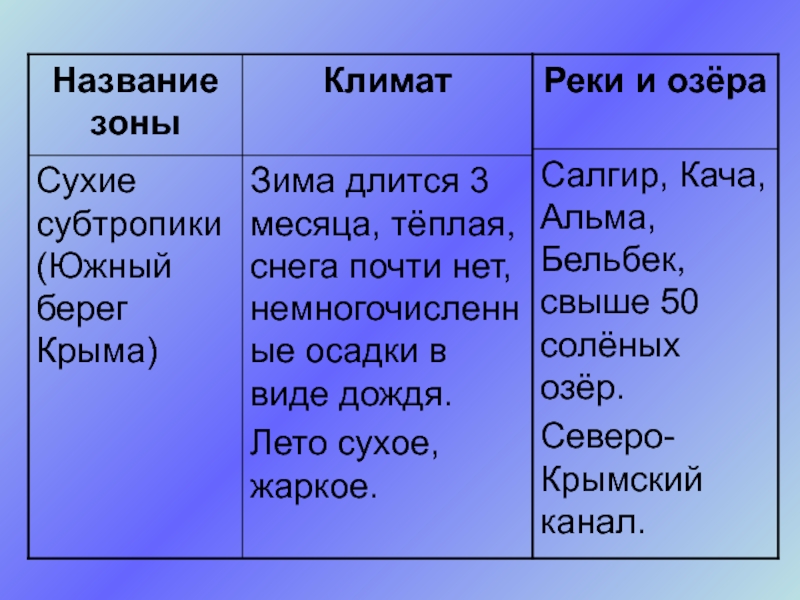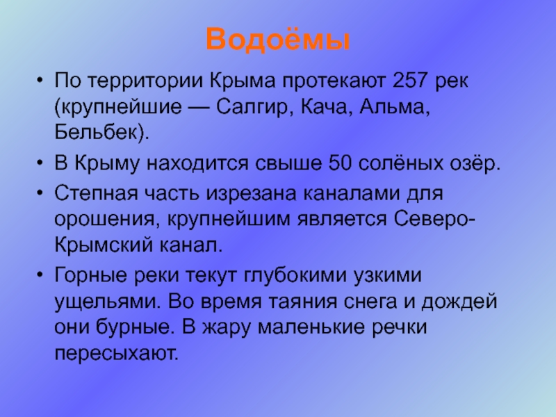 ВодоёмыПо территории Крыма протекают 257 рек (крупнейшие — Салгир, Кача, Альма, Бельбек). В Крыму находится свыше 50