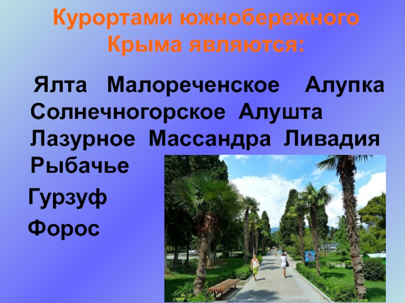 Курортами южнобережного Крыма являются:    Ялта  Малореченское  Алупка  Солнечногорское Алушта   Лазурное Массандра