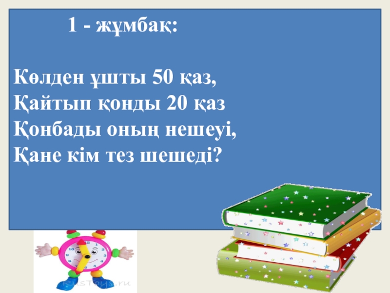 1 - жұмбақ: Көлден ұшты 50 қаз, Қайтып қонды 20