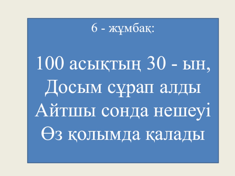 6 - жұмбақ: 100 асықтың 30 - ын, Досым сұрап алды Айтшы сонда нешеуі Өз қолымда