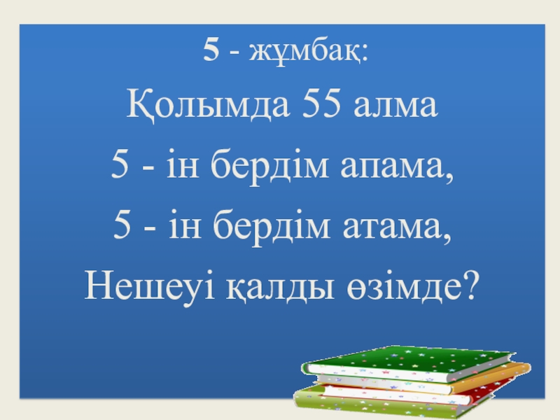 5 - жұмбақ:Қолымда 55 алма 5 - ін бердім апама, 5 - ін бердім атама, Нешеуі