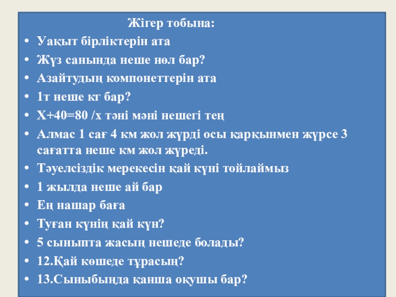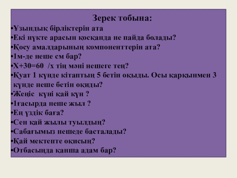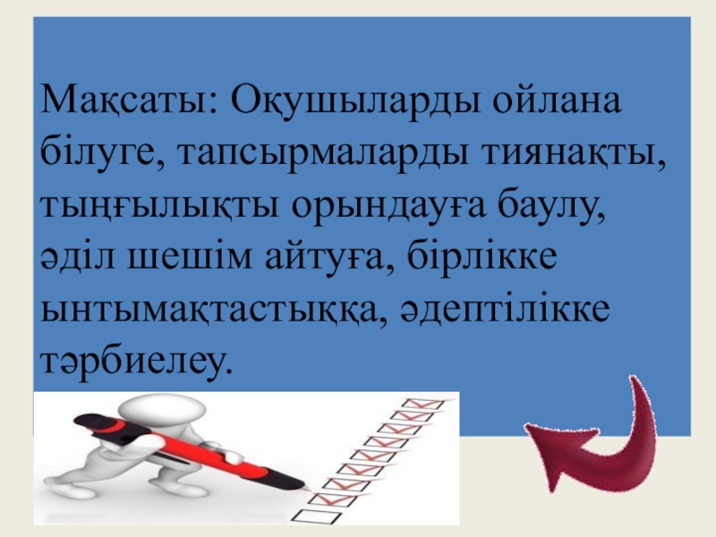 Слайд 2Мақсаты: Оқушыларды ойлана білуге, тапсырмаларды тиянақты, тыңғылықты орындауға баулу, әділ шешім