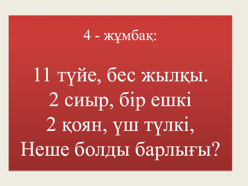 4 - жұмбақ:  11 түйе, бес жылқы. 2 сиыр, бір ешкі 2 қоян, үш түлкі, Неше