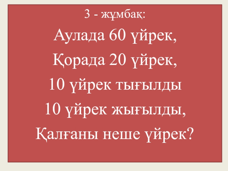3 - жұмбақ: Аулада 60 үйрек, Қорада 20 үйрек, 10 үйрек тығылды 10 үйрек жығылды, Қалғаны неше
