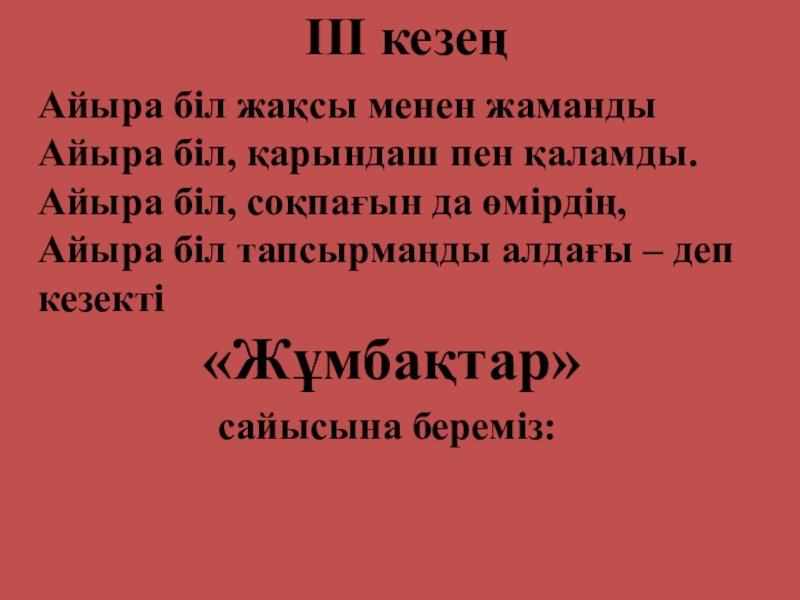 ІІІ кезең  Айыра біл жақсы менен жаманды Айыра біл, қарындаш пен қаламды. Айыра біл, соқпағын