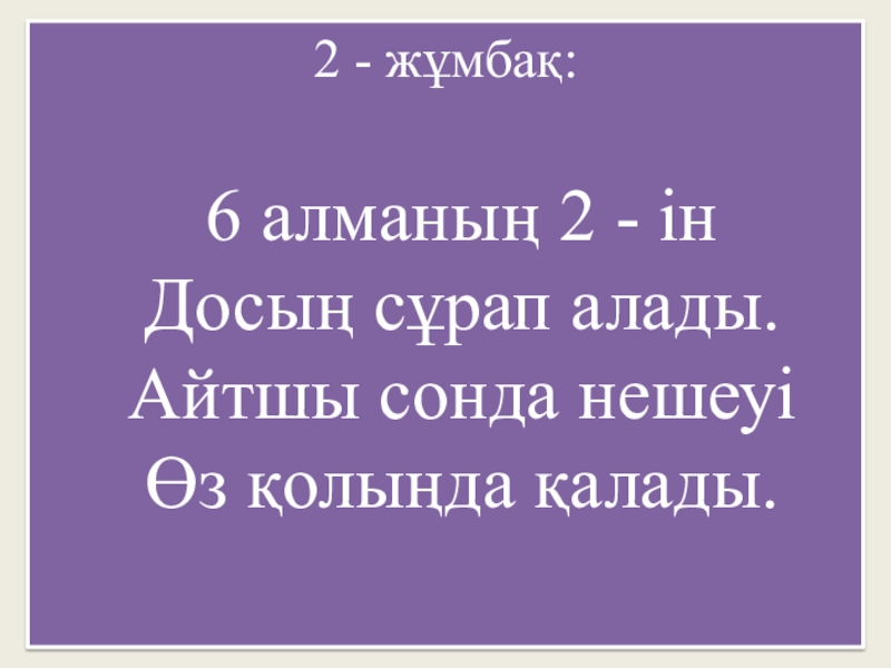 2 - жұмбақ: 6 алманың 2 - ін Досың сұрап алады. Айтшы сонда нешеуі Өз қолыңда қалады.