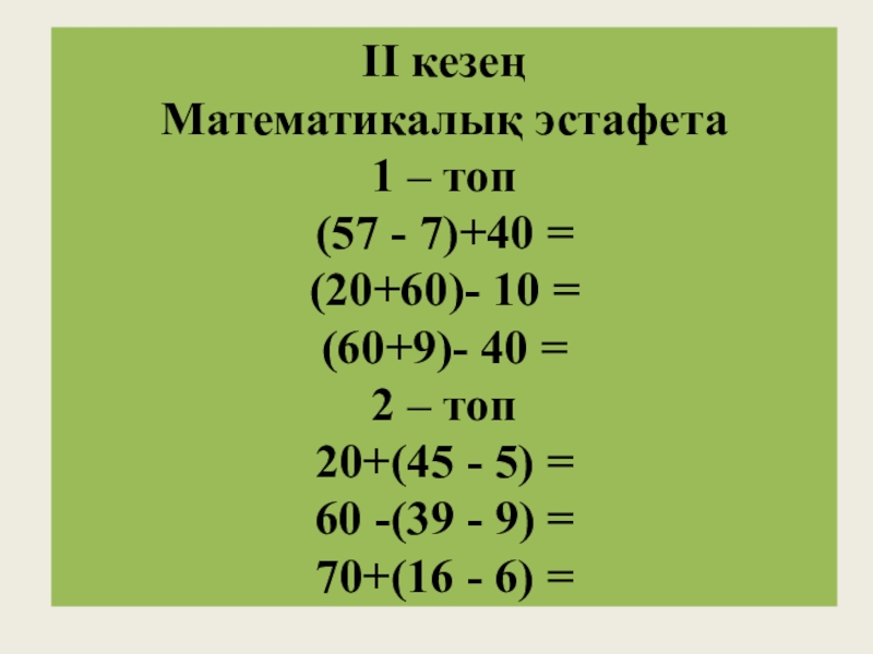 ІІ кезең Математикалық эстафета 1 – топ  (57 - 7)+40 = (20+60)- 10 = (60+9)- 40