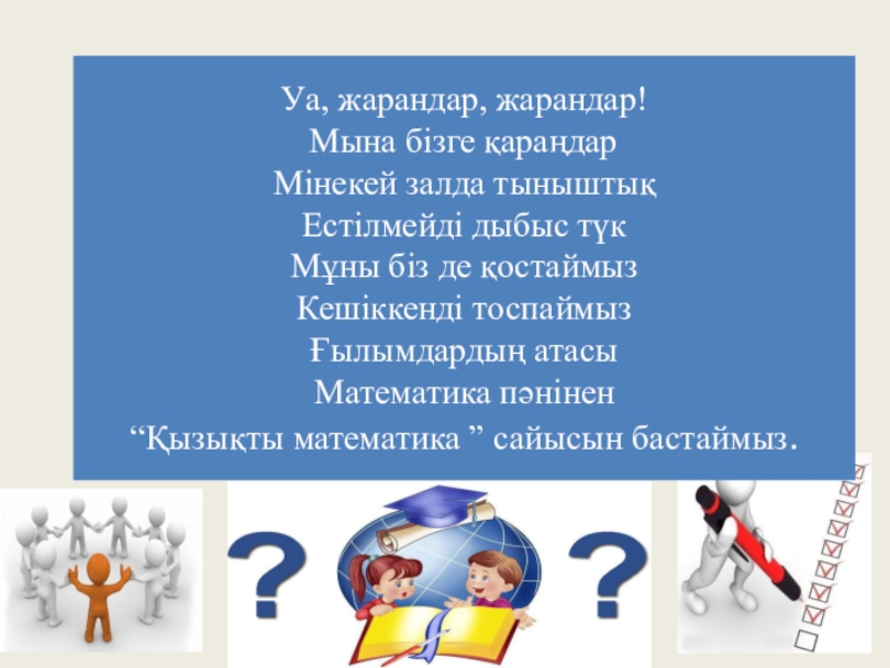 қостаймыз Кешіккенді тоспаймыз Ғылымдардың атасы Математика пәнінен “Қызықты математика ” сайысын бастаймыз.