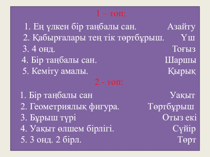 1. Бір таңбалы сан Уақыт 2. Геометриялық фигура. Төртбұрыш 3. Бұрыш түрі Отыз екі 4. Уақыт өлшем бірлігі. Сүйір 5. 3 онд. 2 бірл. Төрт