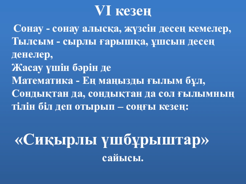 VI кезең    Сонау - сонау алысқа, жүзсін десең кемелер, Тылсым - сырлы ғарышқа, ұшсын