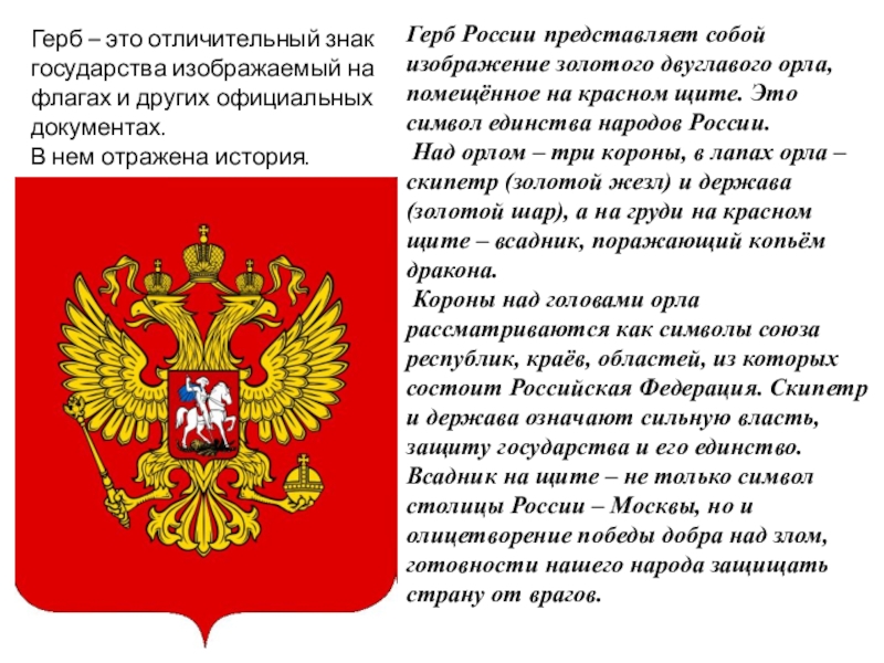 Короны над головами орла рассматриваются как символы союза республик, краёв, областей, из которых состоит Российская Федерация. Скипетр и держава означают сильную власть, защиту государства и его единство. Всадник на щите – не только символ столицы России – Москвы, но и олицетворение победы добра над злом, готовности нашего народа защищать страну от врагов.