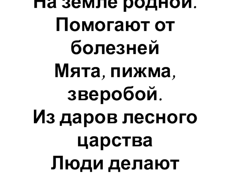 Много трав полезных  На земле родной. Помогают от болезней Мята, пижма, зверобой.  Из даров лесного