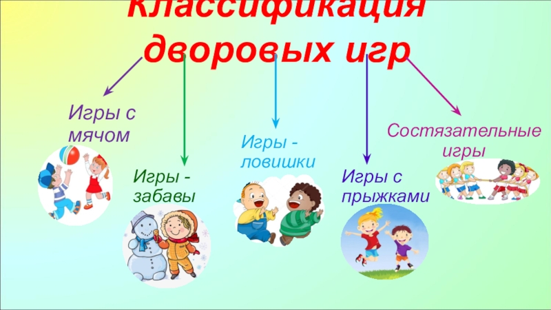 Классификация дворовых игрИгры с мячомИгры - забавыИгры - ловишкиИгры с прыжкамиСостязательные игры