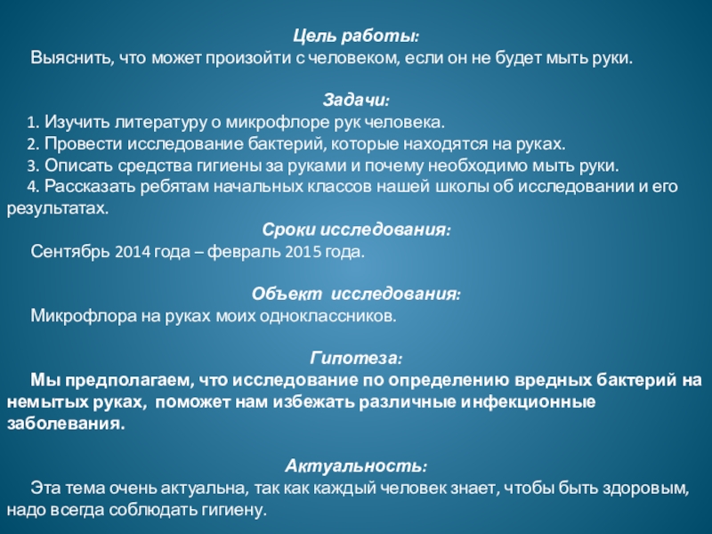 С самого маленького возраста нам постоянно твердят и родители, и воспитатели, и учителя: «Мойте руки». Но зачем? Что опасного есть на руках? Зачем нужно мыть руки? Мне захотелось найти ответы на эти вопросы, так появилась тема нашей исследовательской работы.