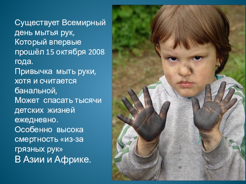 узнать об истории гигиены рук человека, какие бактерии находятся у нас на руках, как они попадают на ру-ки, какие заболе-вания могут вызывать эти бактерии, каким мылом лучше всего пользоваться и как правильно надо мыть руки.