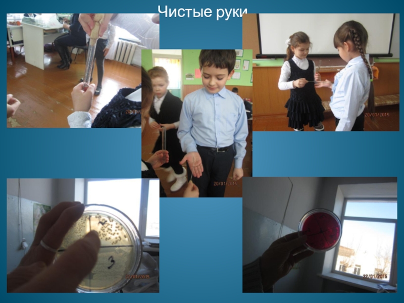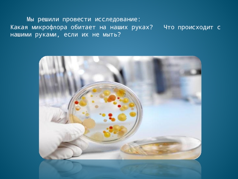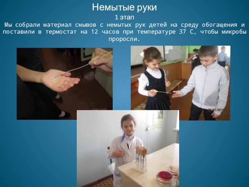 Слайд 13 Мы начали проводить исследования, беря смывы с рук