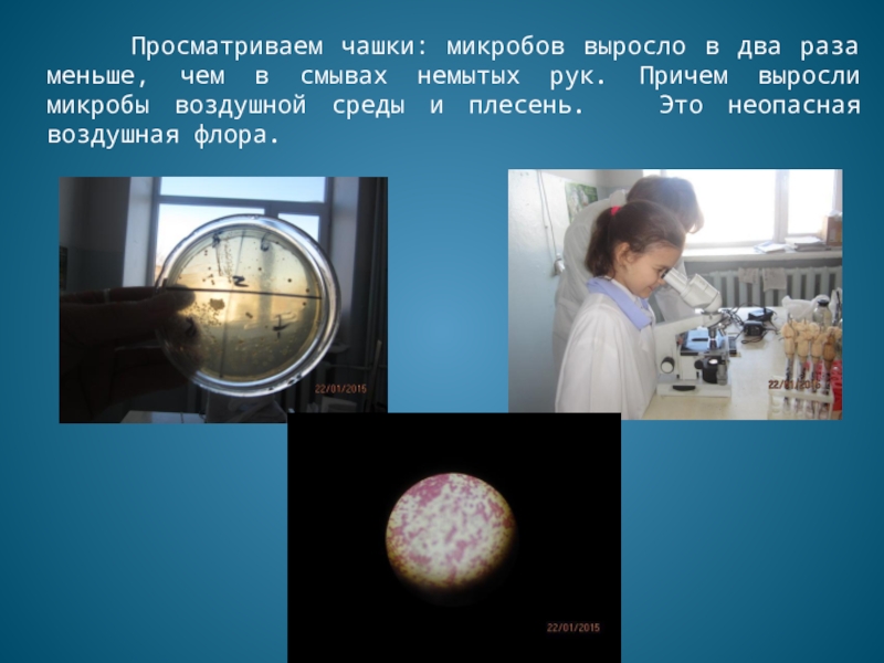 раза меньше, чем в смывах немытых рук. Причем выросли микробы воздушной среды и плесень. Это неопасная воздушная флора.
