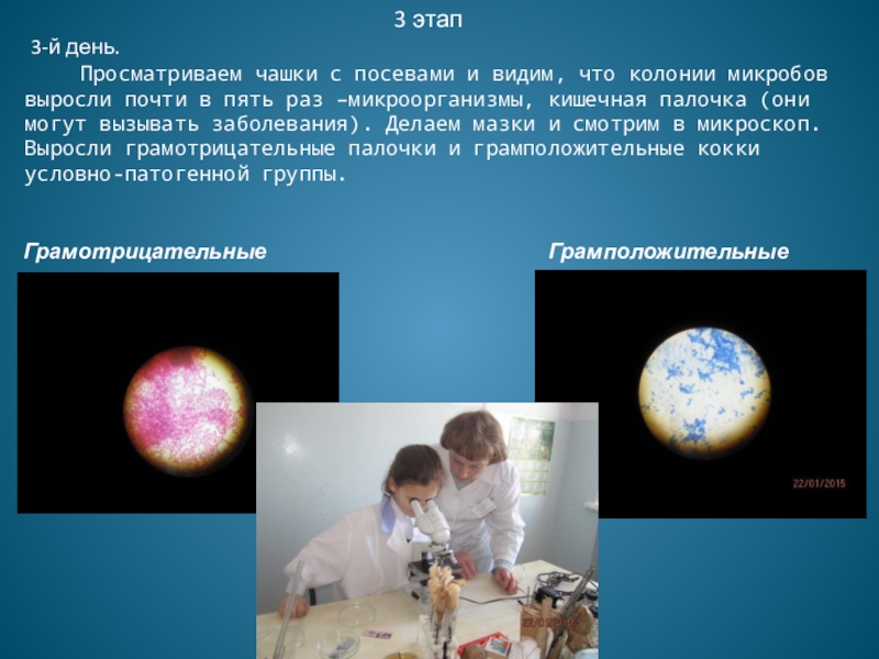 Просматриваем чашки с посевами и видим, что колонии микробов выросли почти в пять раз –микроорганизмы, кишечная палочка (они могут вызывать заболевания). Делаем мазки и смотрим в микроскоп. Выросли грамотрицательные палочки и грамположительные кокки условно-патогенной группы.