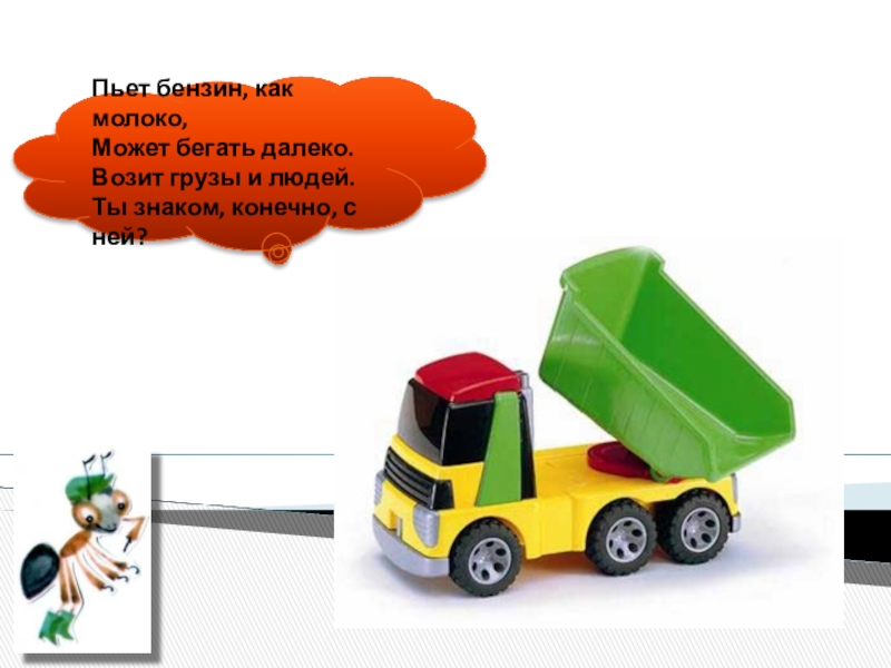Пьет бензин, как молоко,Может бегать далеко.Возит грузы и людей.Ты знаком, конечно, с ней?