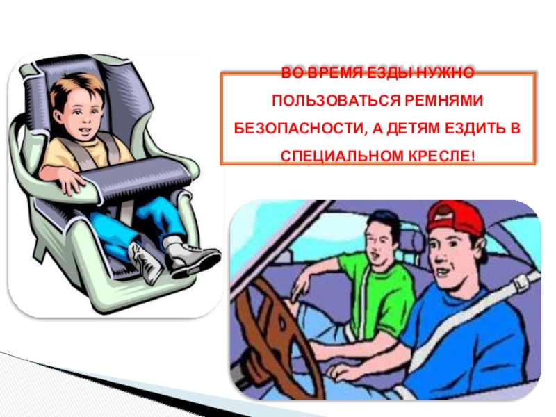 Слайд 26ВО ВРЕМЯ ЕЗДЫ НУЖНО ПОЛЬЗОВАТЬСЯ РЕМНЯМИ БЕЗОПАСНОСТИ, А ДЕТЯМ ЕЗДИТЬ В СПЕЦИАЛЬНОМ КРЕСЛЕ!