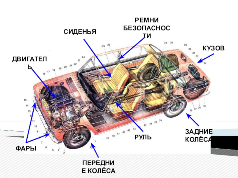 ФАРЫПЕРЕДНИЕ КОЛЁСАЗАДНИЕ КОЛЁСАКУЗОВДВИГАТЕЛЬРУЛЬРЕМНИ БЕЗОПАСНОСТИСИДЕНЬЯ