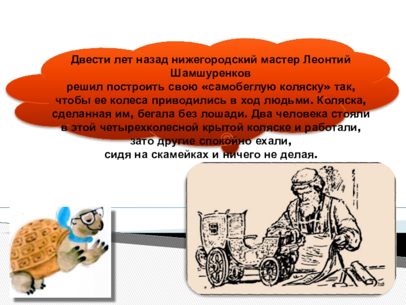 Двести лет назад нижегородский мастер Леонтий Шамшуренков решил построить свою «самобеглую коляску» так, чтобы ее колеса приводились