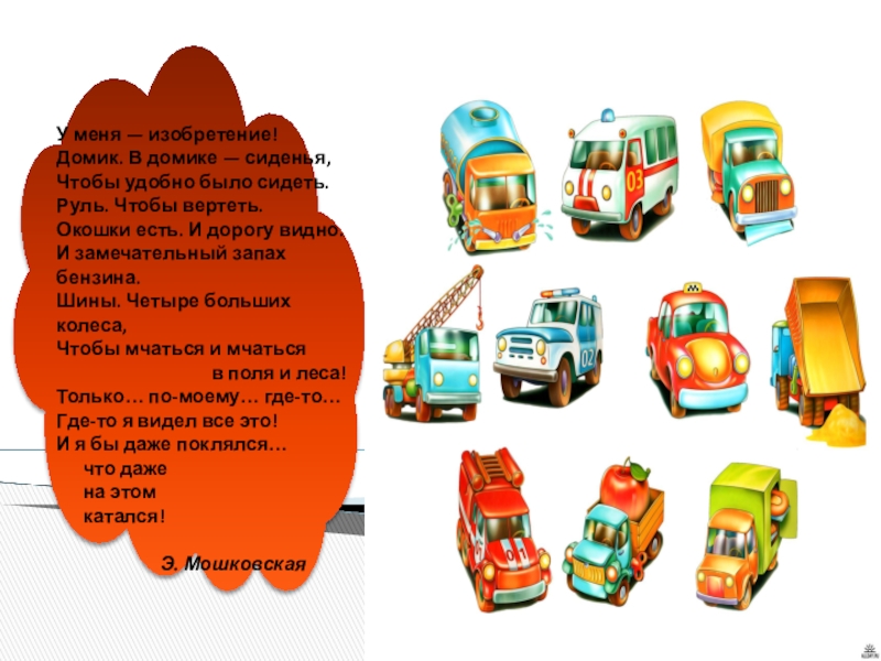 У меня — изобретение!  Домик. В домике — сиденья,  Чтобы удобно было сидеть.  Руль. Чтобы вертеть. Окошки есть.