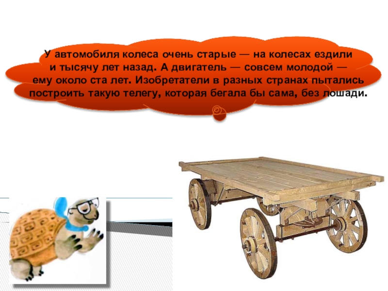 ему около ста лет. Изобретатели в разных странах пытались построить такую телегу, которая бегала бы сама, без лошади.