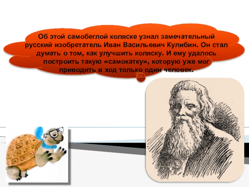Об этой самобеглой коляске узнал замечательный русский изобретатель Иван Васильевич Кулибин. Он стал думать о том, как