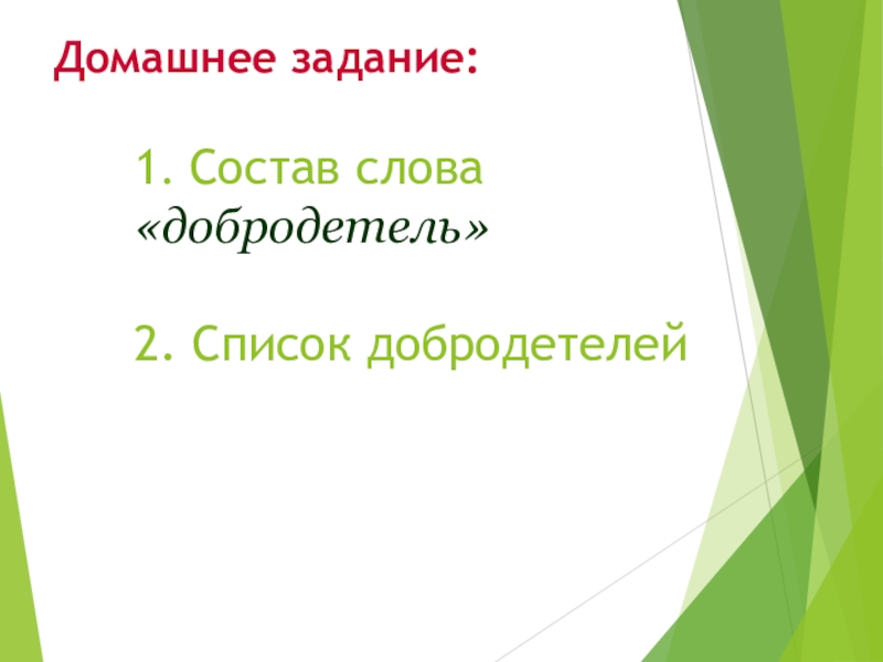 Слайд 12Домашнее задание: 1. Состав слова «добродетель» 2. Список добродетелей