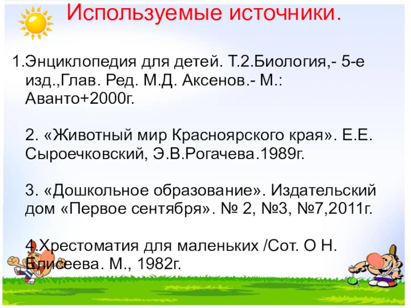 1.Энциклопедия для детей. Т.2.Биология,- 5-е изд.,Глав. Ред. М.Д. Аксенов.- М.:Аванто+2000г.