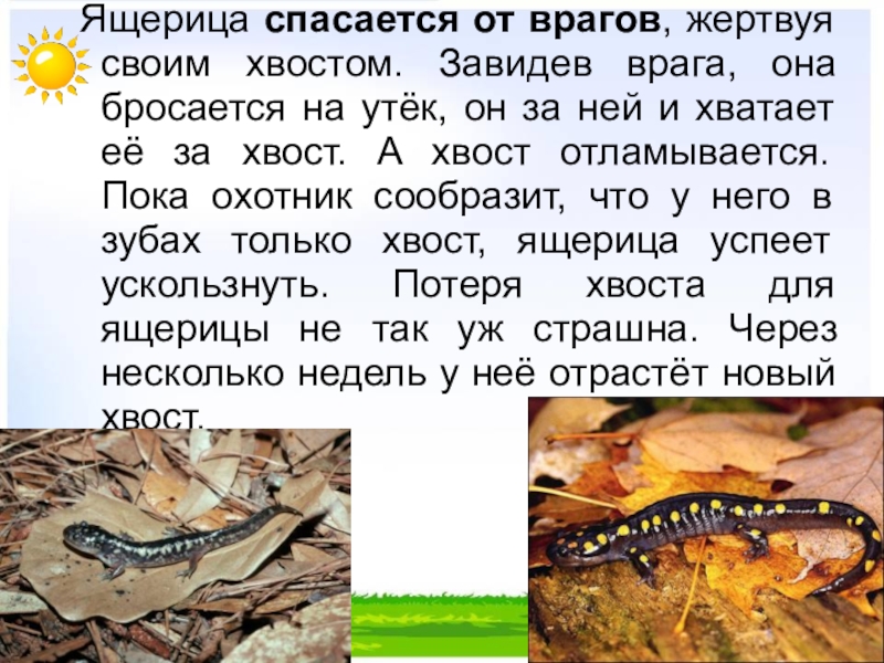 Слайд 25Ящерица спасается от врагов, жертвуя своим хвостом. Завидев врага, она бросается