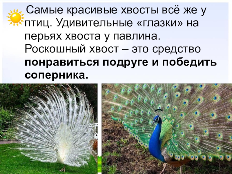 Слайд 29 Самые красивые хвосты всё же у птиц. Удивительные «глазки» на
